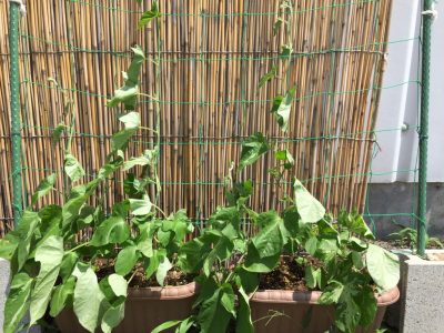 南教室の窓の外。強烈な日差しと吹きつける風に耐えながら、朝顔が育っています。
