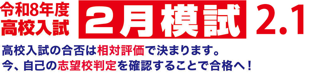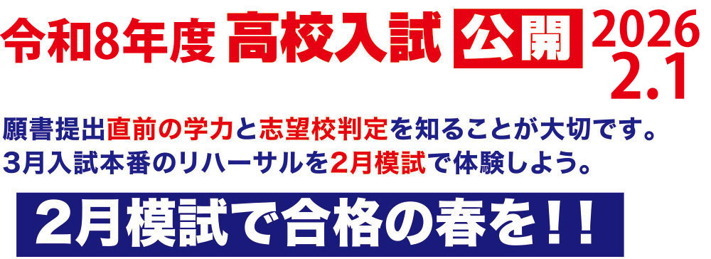 また2月模試は3月の入試本番を想定して作成しているので入試当日の格好の練習となります。受験生の皆さん、これからは2月模試を目標に計画的学習をしてください。そして、その延長線上に必ず合格の春が皆さんを待っています。すばらしい春を笑顔で迎えるための2月模試受験に向けて、今スタートしてください。