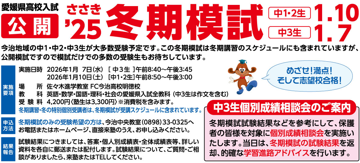 ※中3生は冬期模試・2月模試 計2回の一括申込も受け付けできます。一括申込の場合は受講料は8,000円です。