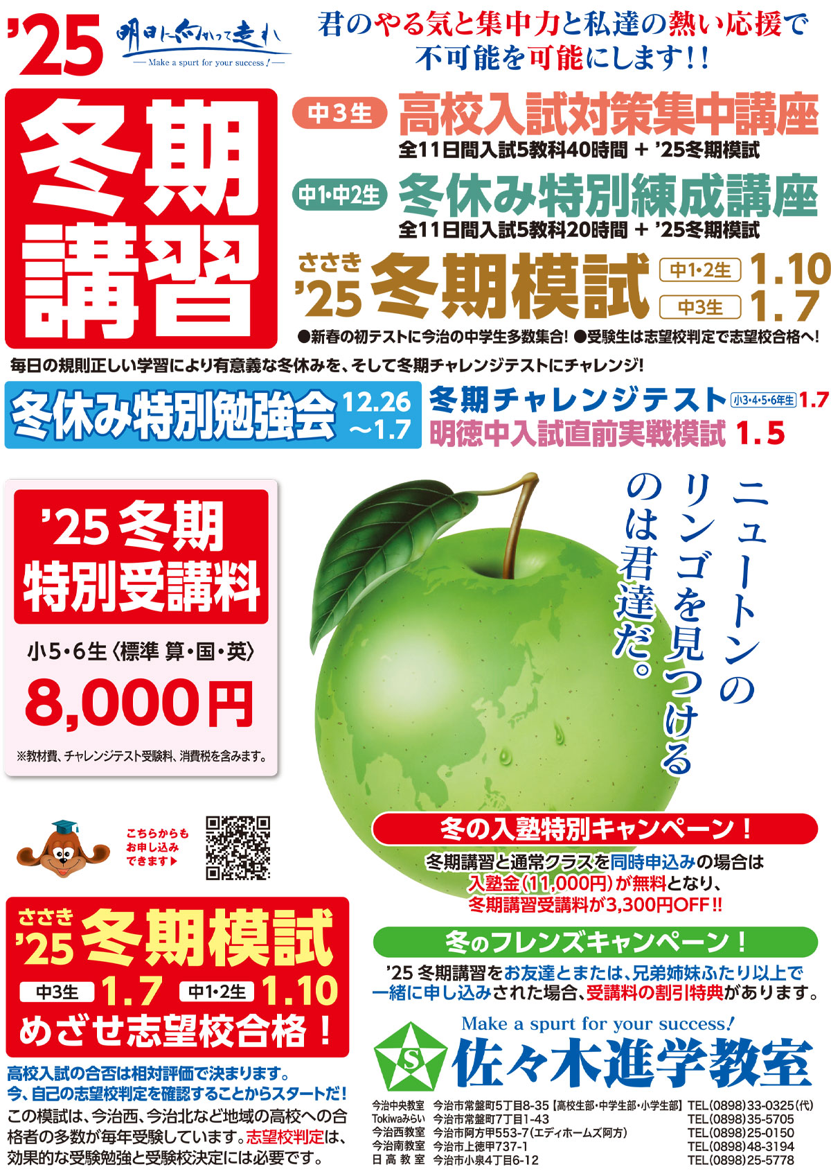 佐々木進学教室では、冬休み中、「高校入試対策’25冬期講習」を開講します。この冬休みは、皆さんにとって最後のチャンスといっても過言ではありません。この冬休みを契機に、一気に入試に向かってラストスパートをかけなければいけません。とにかく、より高い実力をつけたい人、また、一人で勉強していてわからないところがある人、何がなんでも、もうこの冬休みにかけている人、是非「冬期講習」で志望校合格を目指してください。頑張っている人、やる気がある人には私たちは熱く応援致します。